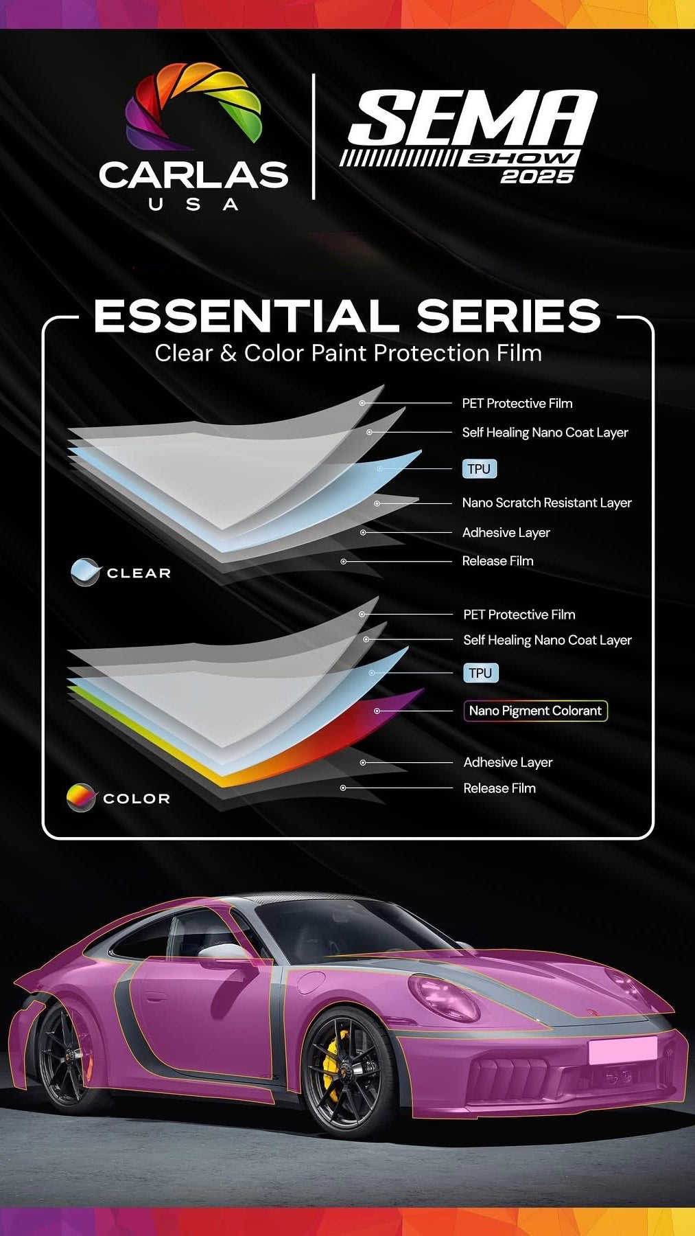 Unlock unlimited creativity with Carlas Printable Paint Protection Film – Engineered for custom graphics, wraps and branding without compromising protection.‣ Game-Changing technology‣ Print custom designs directly onto high-quality PPF‣ Durable self-healing surface protection, while supporting vibrant, high-resolution prints.‣ Discover endless possibilities for personalization in wraps, branding, and protection.CARLAS USA is transforming the industry by combining superior paint protection with seamless digital printing capabilities. Ideal for auto shops, fleet operators, and customizers, this innovation reduces installation time, cuts material costs, and enables one-of-a-kind designs that stand out on the road."We're thrilled to debut this game-changing technology at SEMA. Our printable PPF isn't just a product, It's a new era for customization."
